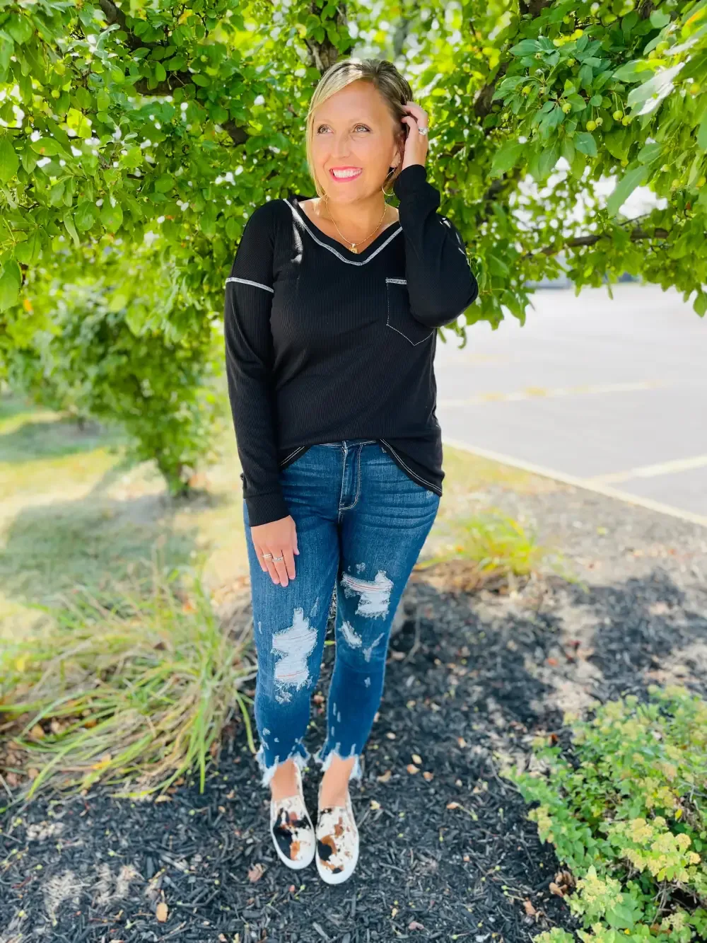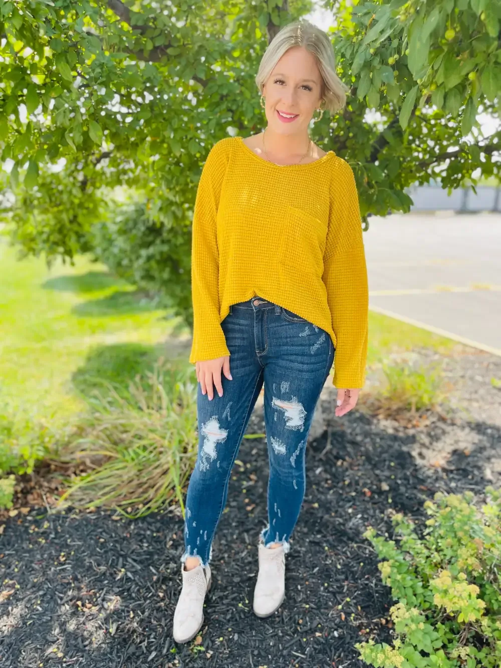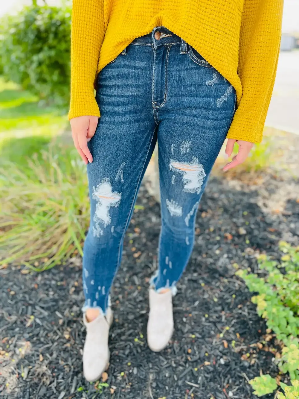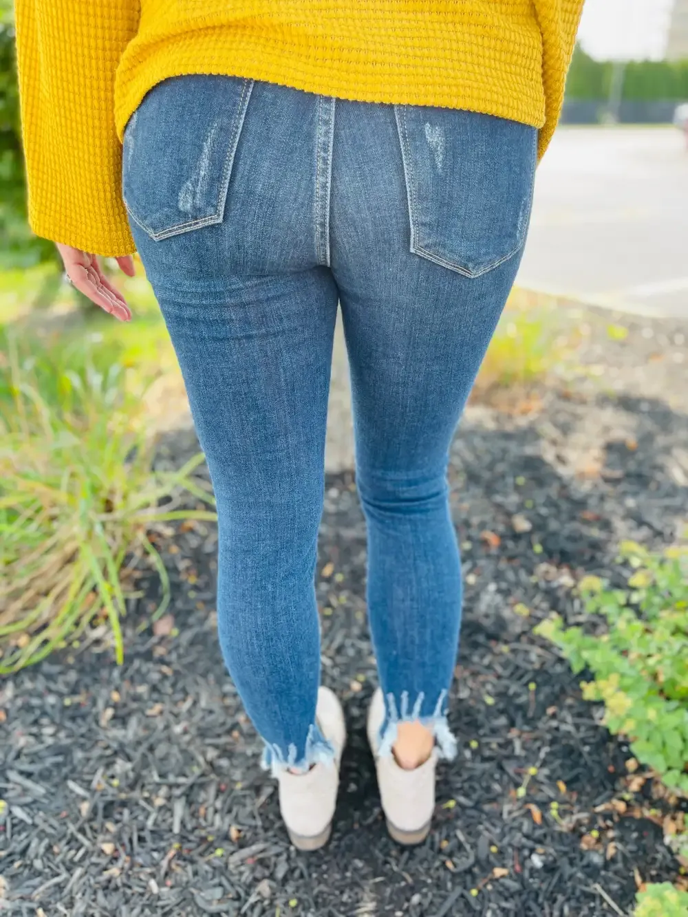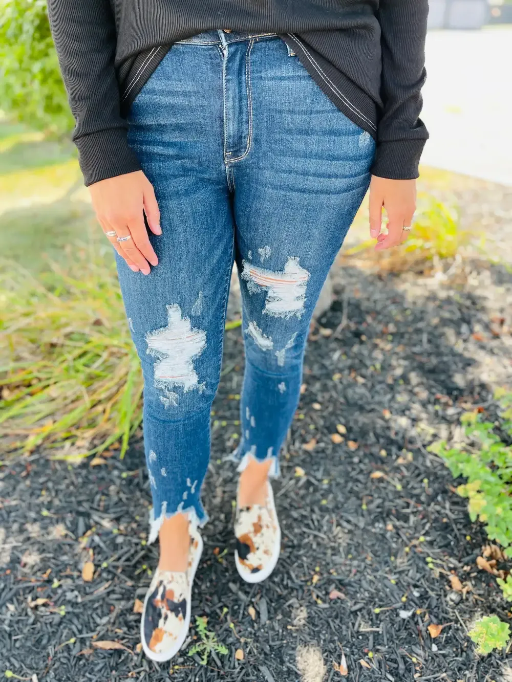 These dark wash jeans have an awesome grain, which make them extra slimming on your thighs! We love how confident we feel in these jeans! The distressing is adorable and the sharkbite hem looks amazing paired with booties or sneakers to dress these up or down.