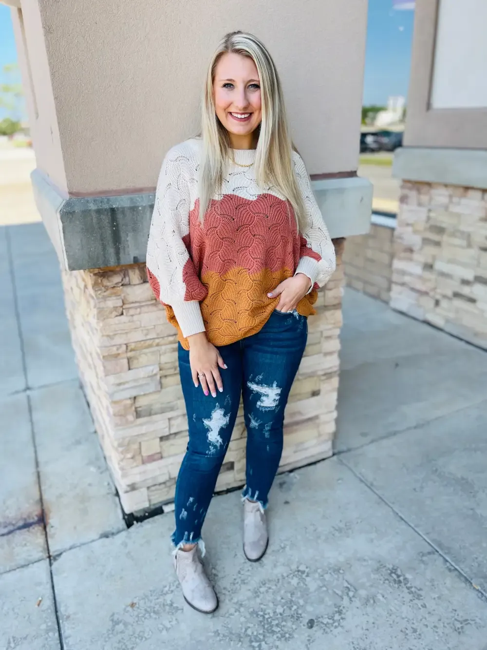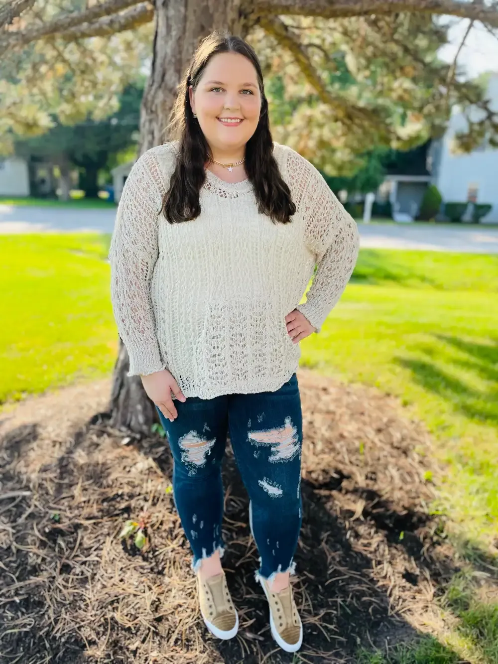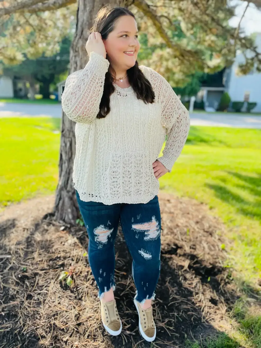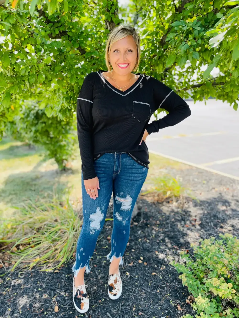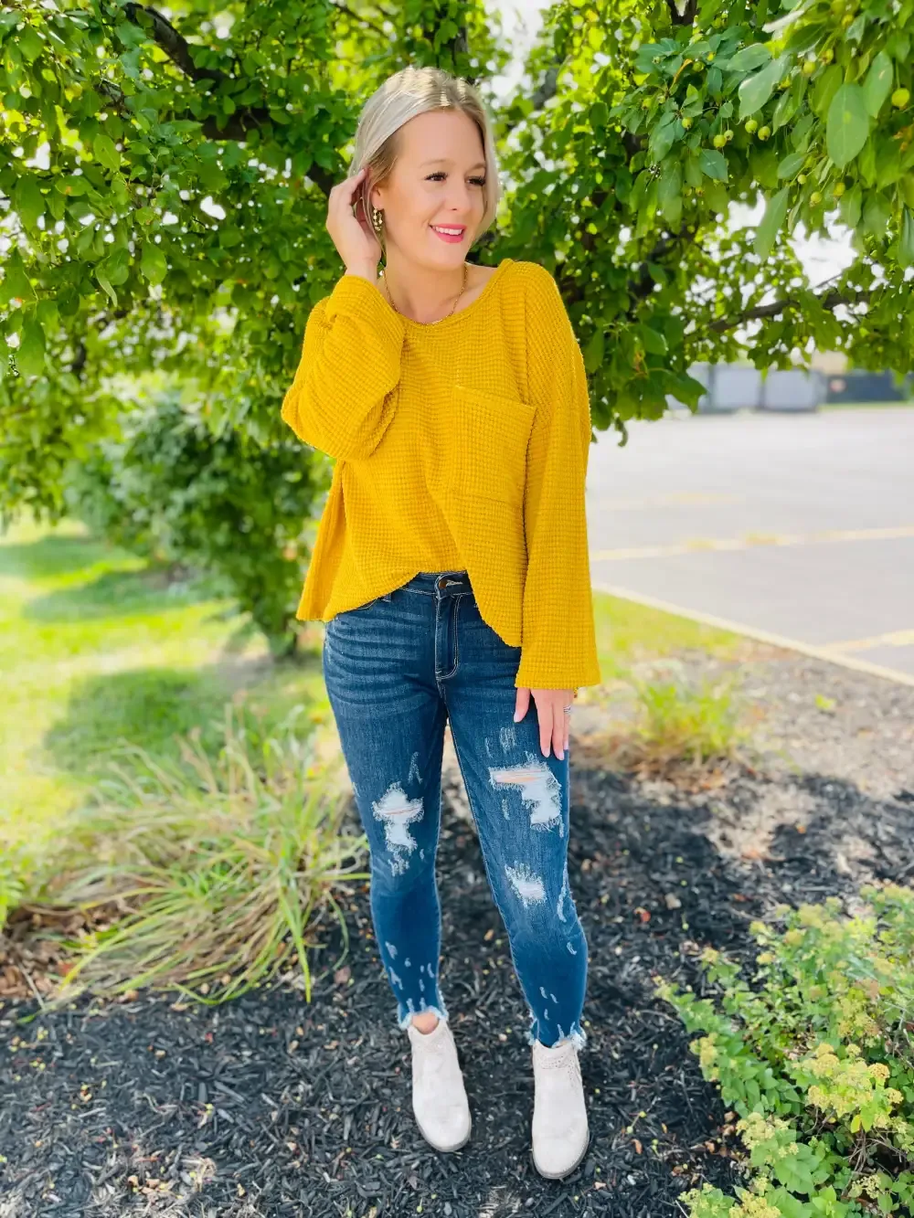These dark wash jeans have an awesome grain, which make them extra slimming on your thighs! We love how confident we feel in these jeans! The distressing is adorable and the sharkbite hem looks amazing paired with booties or sneakers to dress these up or down.
