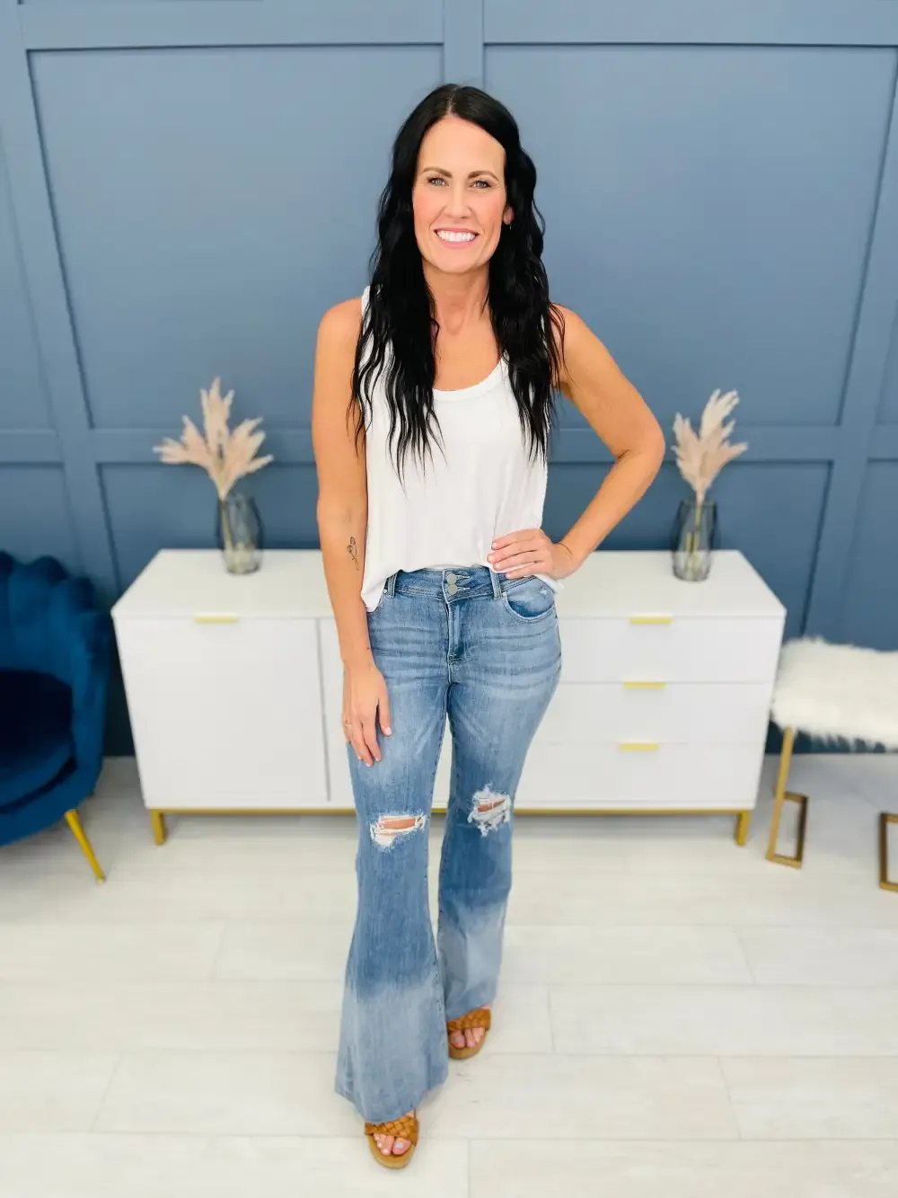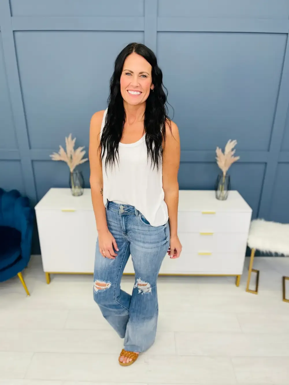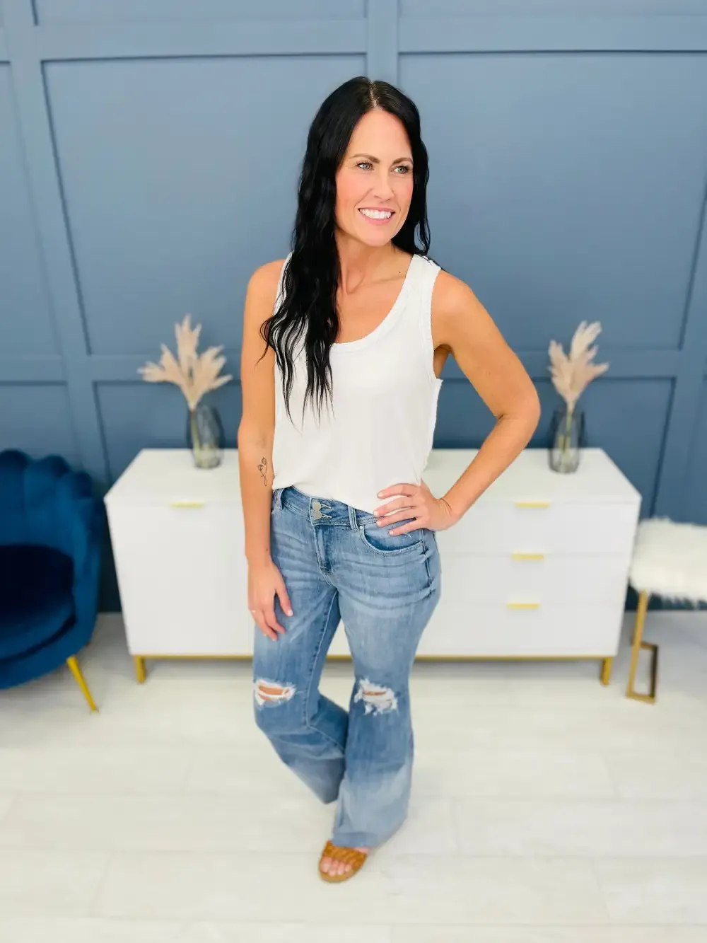 Vee is wearing these jeans with the Shared Memories cardigan.