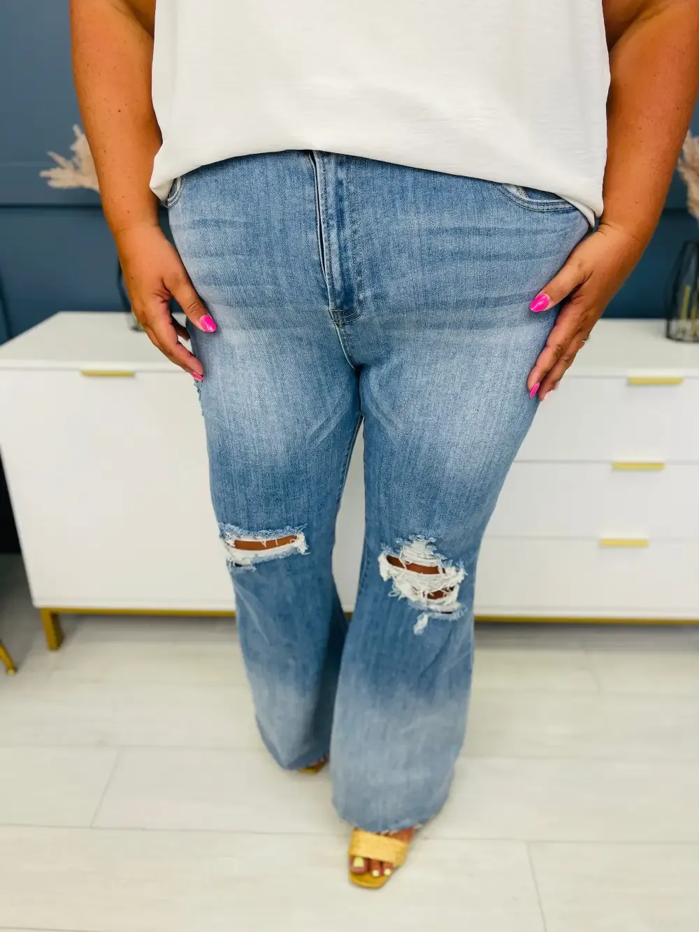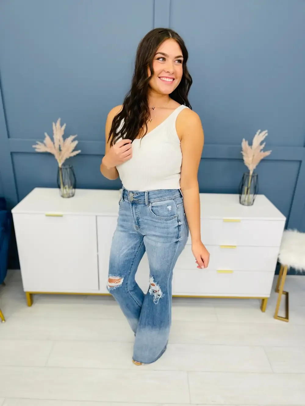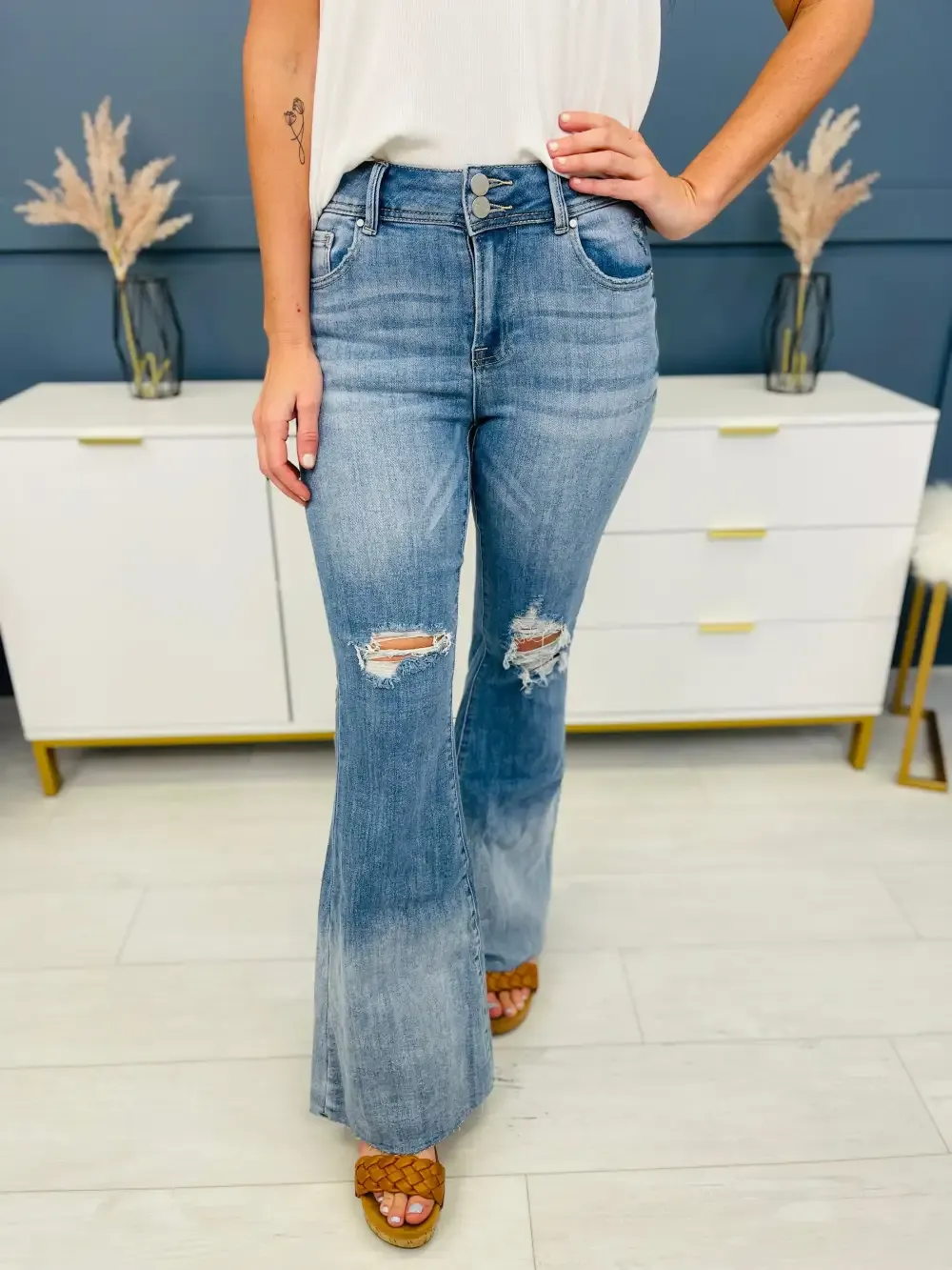 Flares are SO in right now, and we found this amazing style with so much to love! These jeans have a double button feature and gorgeous whiskering on a medium wash that will make your legs look long and lean and smooth you out in all the right places!